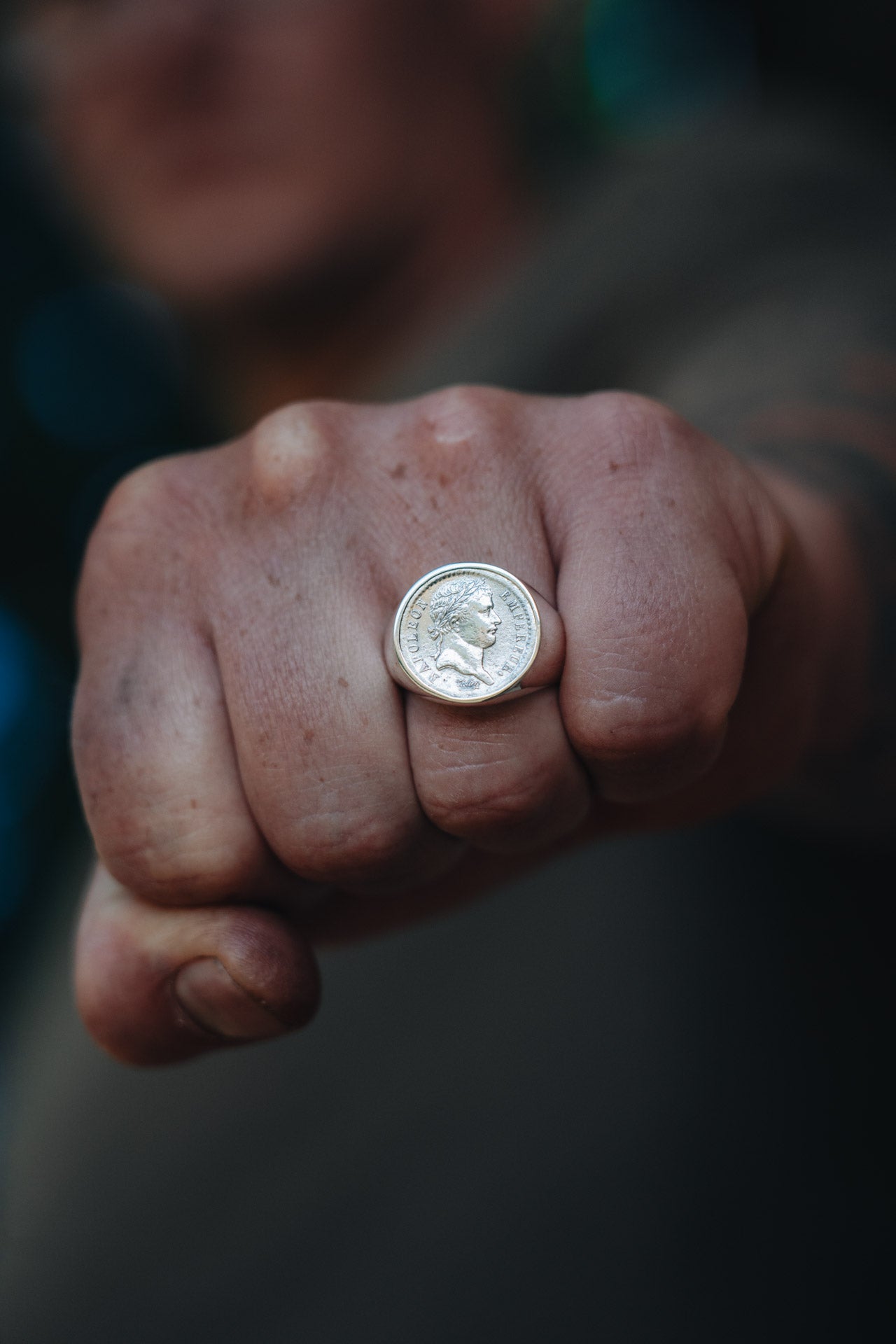 Découvrez la majestueuse chevalière Napoléon 1er réalisée avec une véritable pièce de monnaie d'époque.