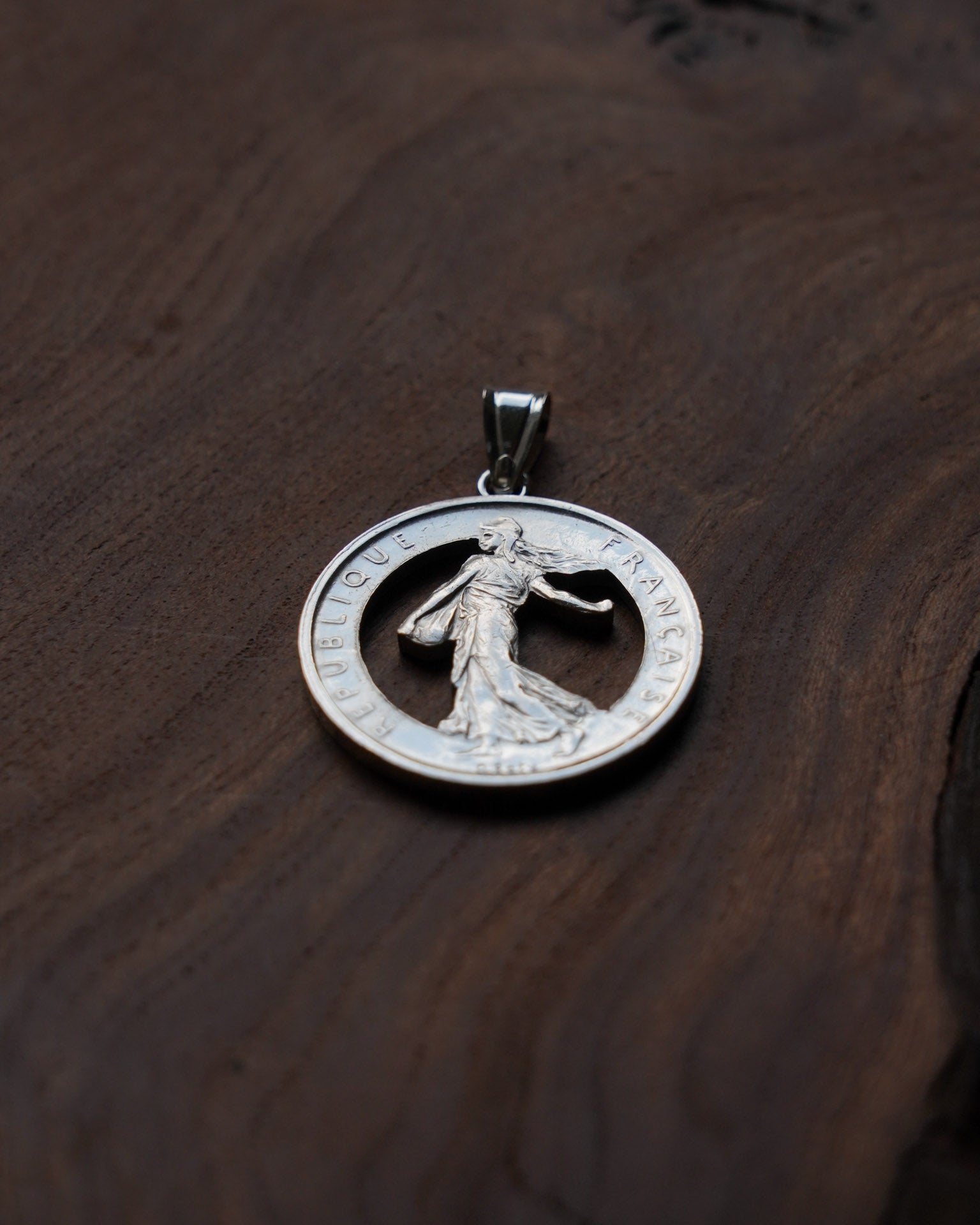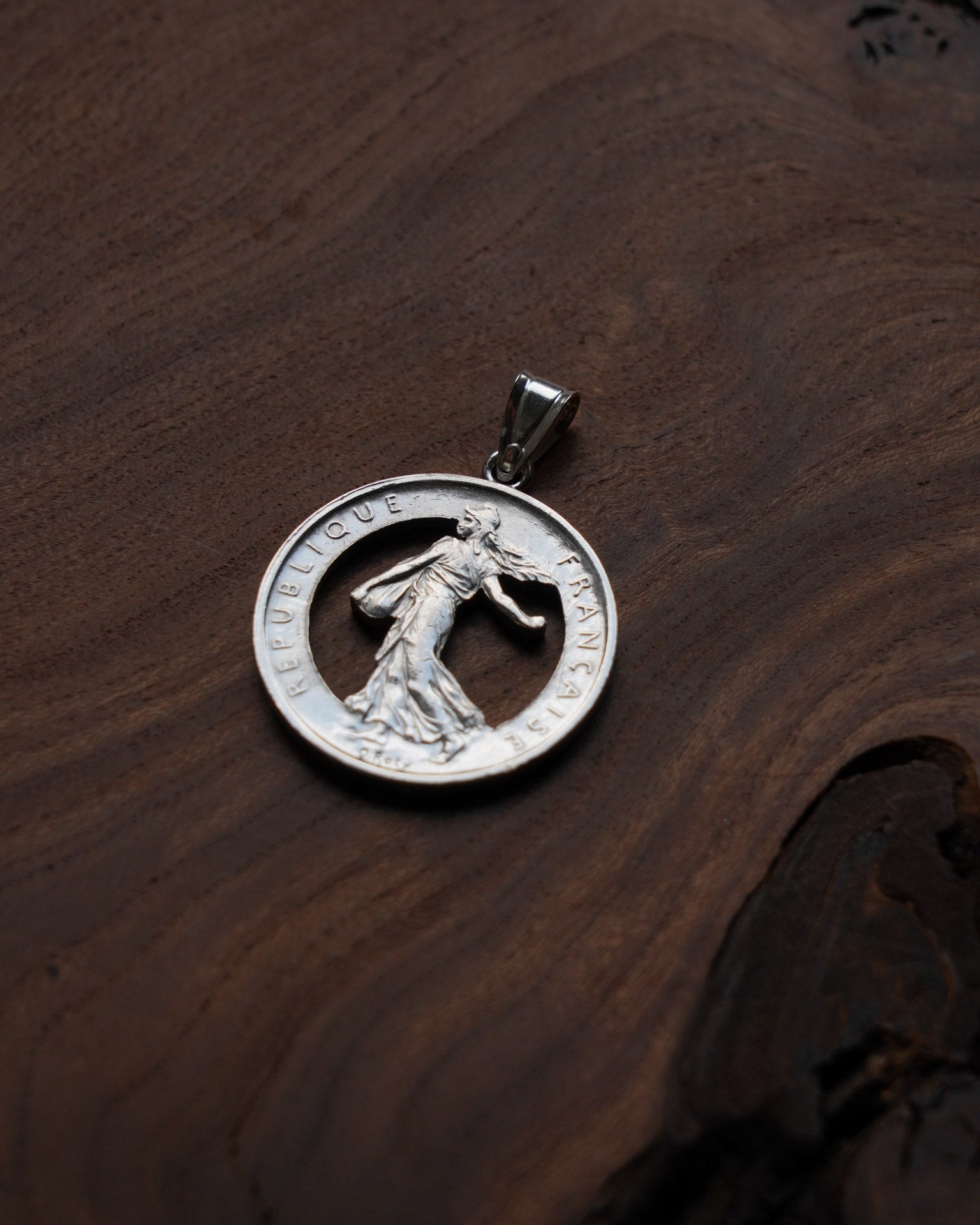 Ce pendentif unique est réalisé à partir d’une authentique pièce de 5 Francs en argent, frappée entre 1959 et 1969. Avec ses 29 mm de diamètre, cette pièce a été soigneusement découpée à la main pour mettre en valeur la silhouette emblématique de la Semeuse, figure forte et poétique de la République française.