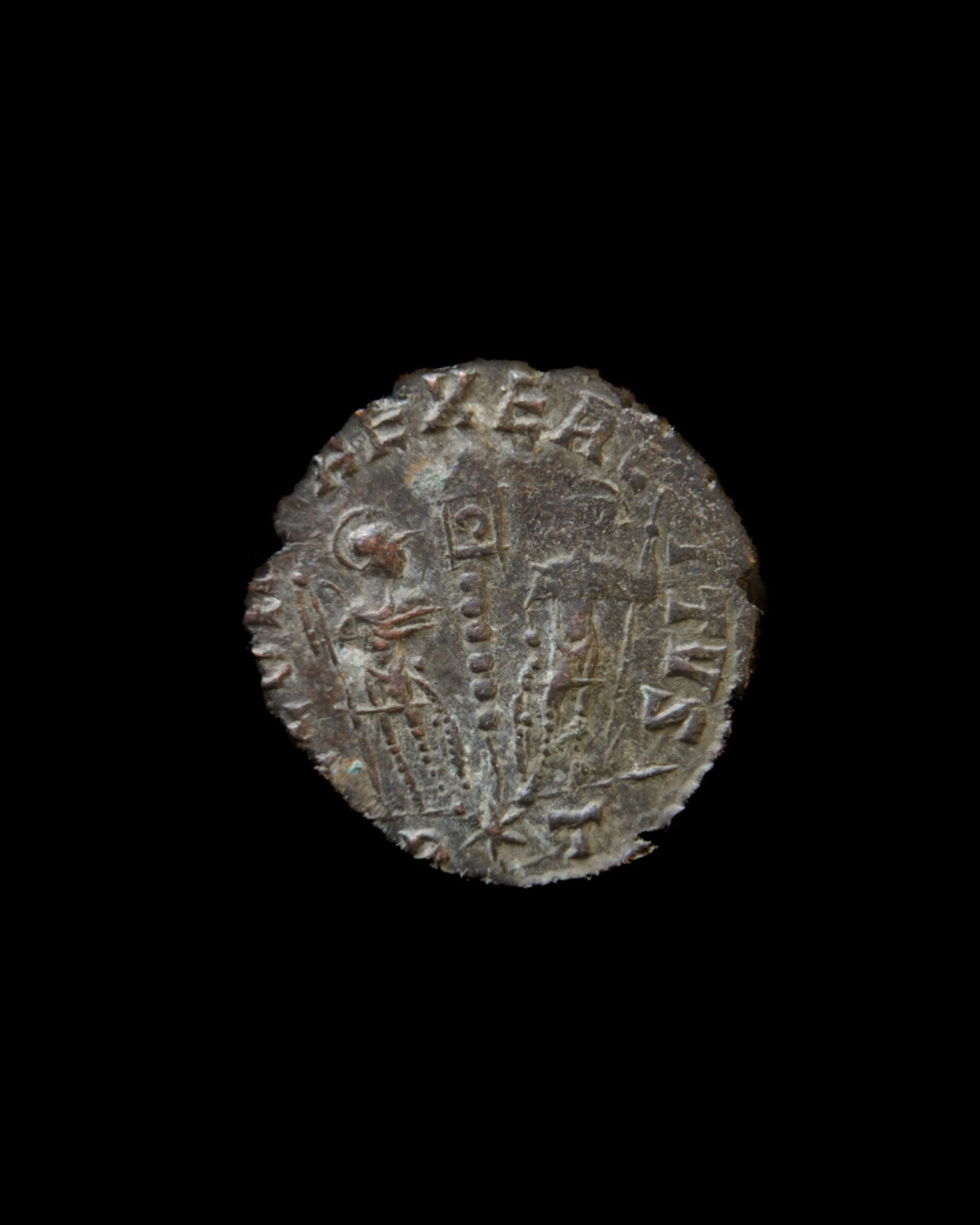 Revers : Deux soldats romains debout face à face, séparés par une enseigne militaire – un symbole de vigilance, de loyauté et de défense.