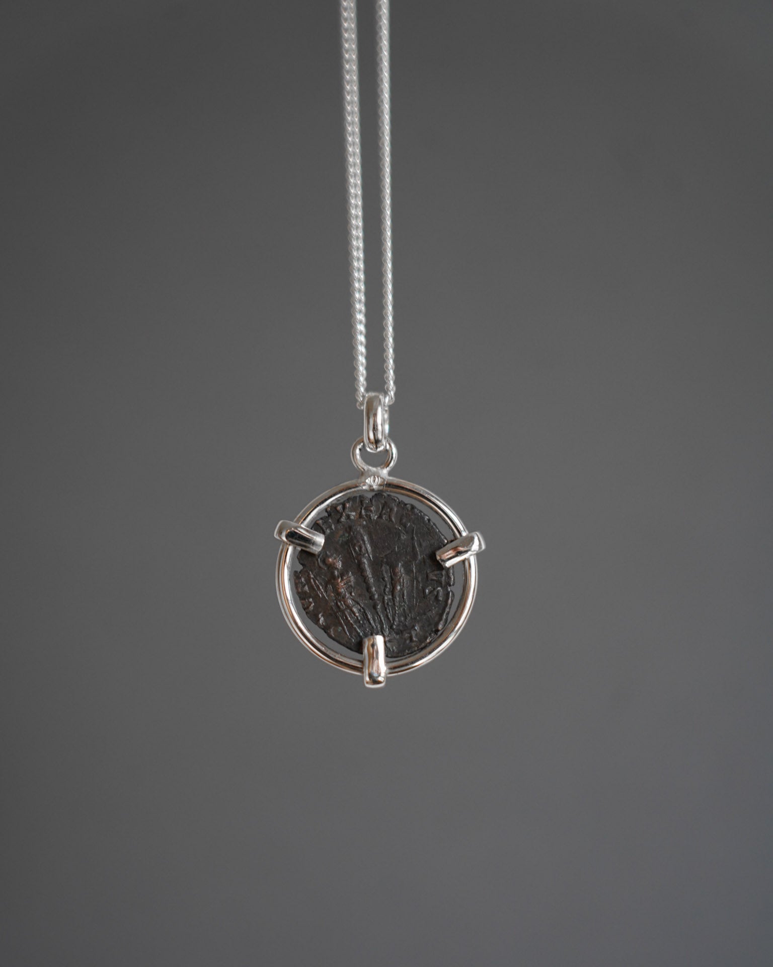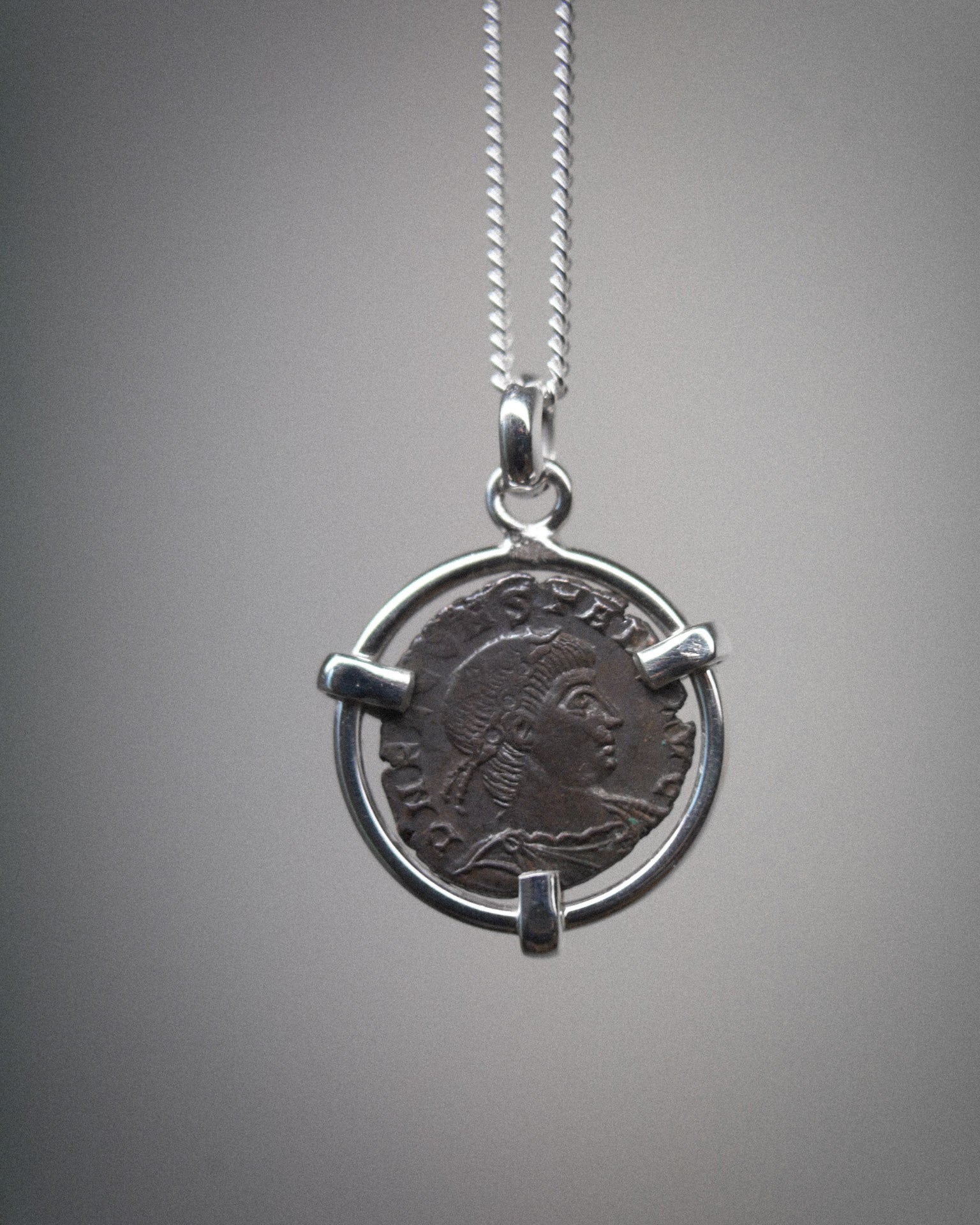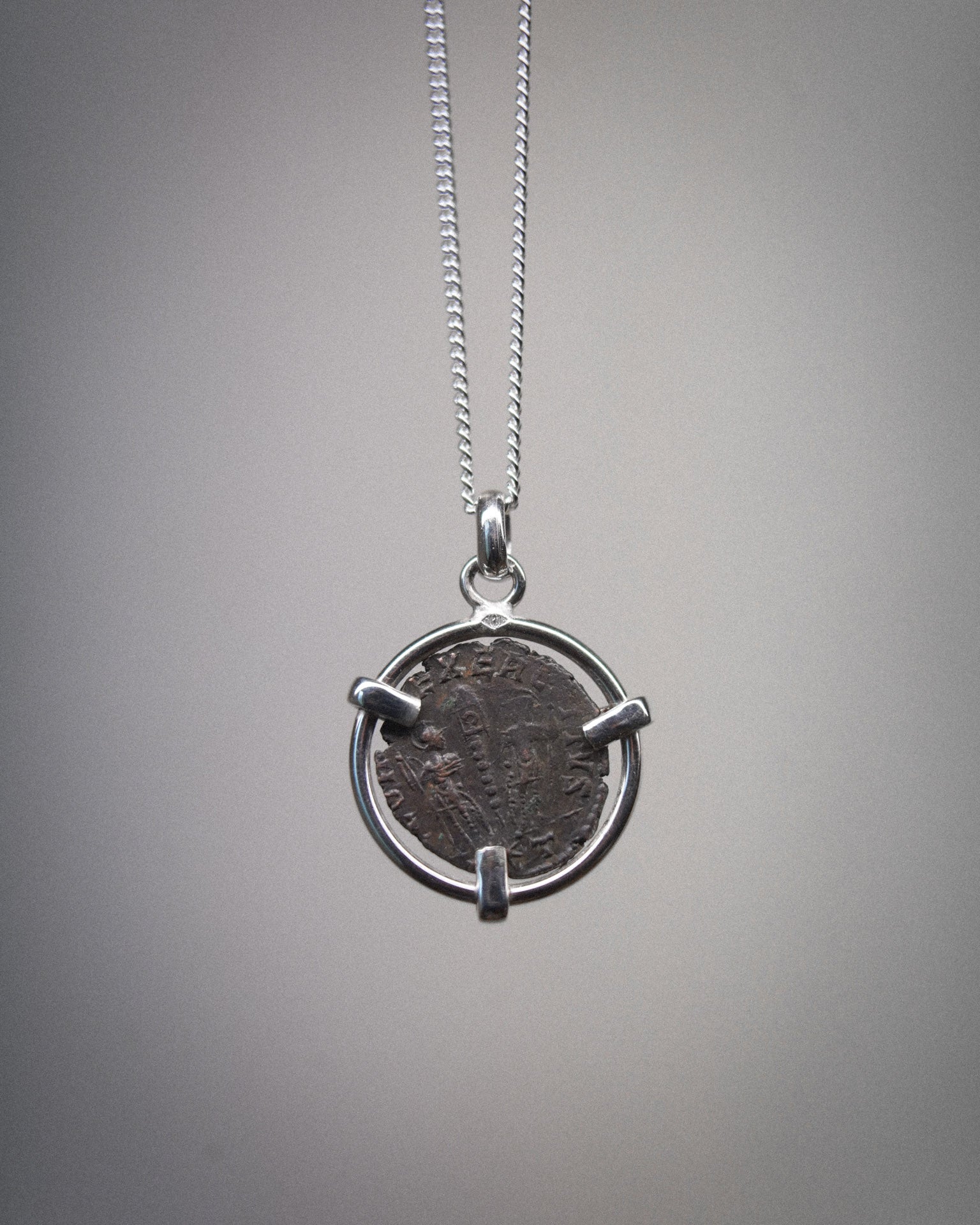 Ce pendentif unique a été réalisé avec une véritable pièce de monnaie romaine en cuivre, datant de 340 après J.-C., sous le règne de Constance II. Sertie dans une monture en argent massif à trois griffes, la pièce peut être portée face avers ou revers, selon le message que l'on souhaite mettre en avant.