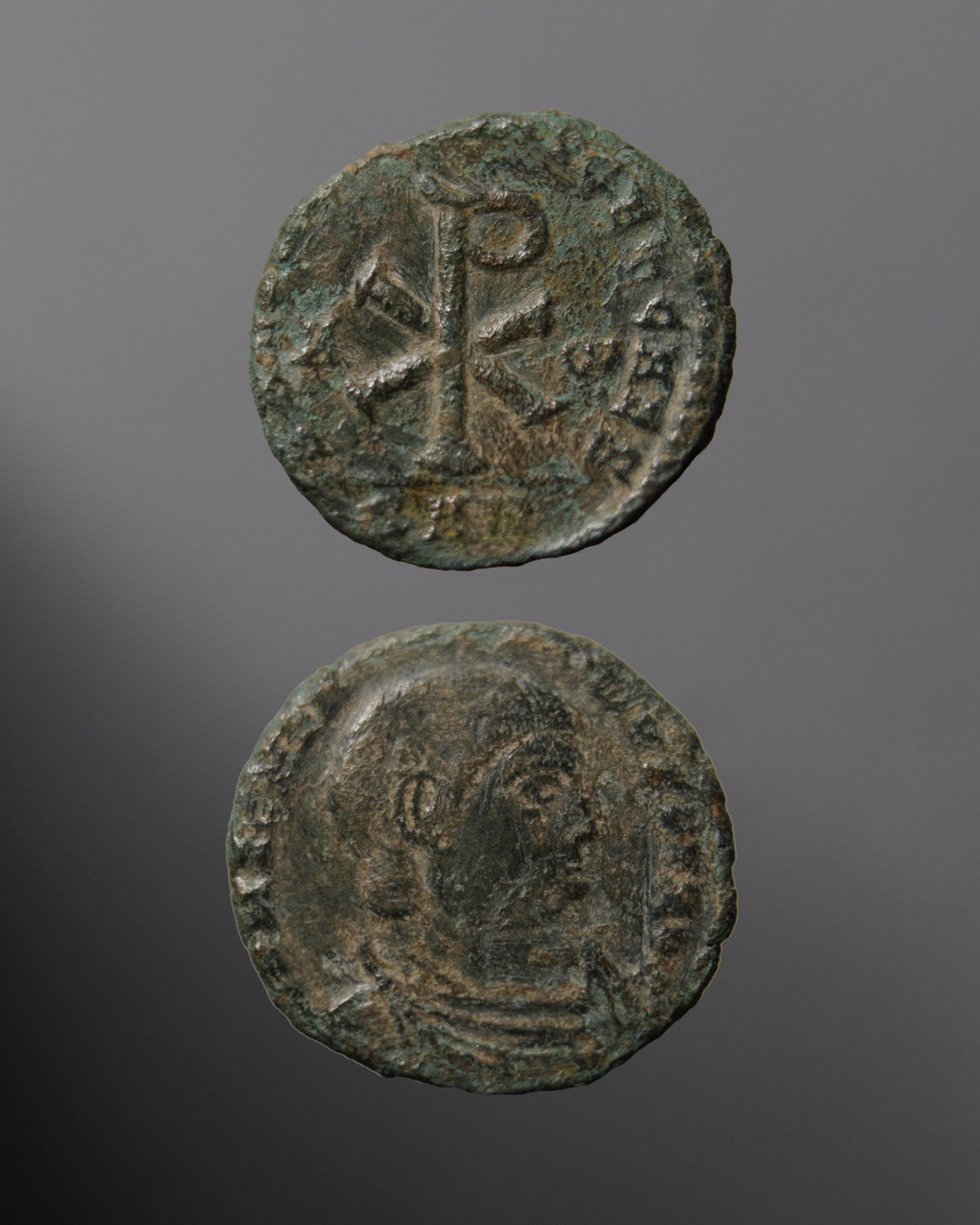 Sur le revers de cette pièce rare figure un Chrisme monumental, le premier symbole utilisé pour désigner le Christ, formé des lettres grecques X (Chi) et P (Rho).