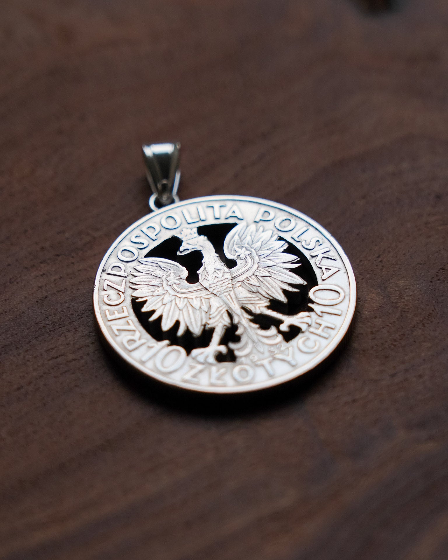 Découvrez notre magnifique pendentif pièce qui met en valeur l'emblème de la Pologne. Ce bijou est réalisé à partir d'une authentique pièce de monnaie polonaise des années 30, soigneusement découpée pour mettre en avant son emblème distinctif. Fabriqué en argent massif, ce pendentif de 35 mm de diamètre est à la fois élégant et chargé d'histoire.