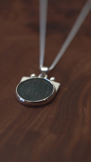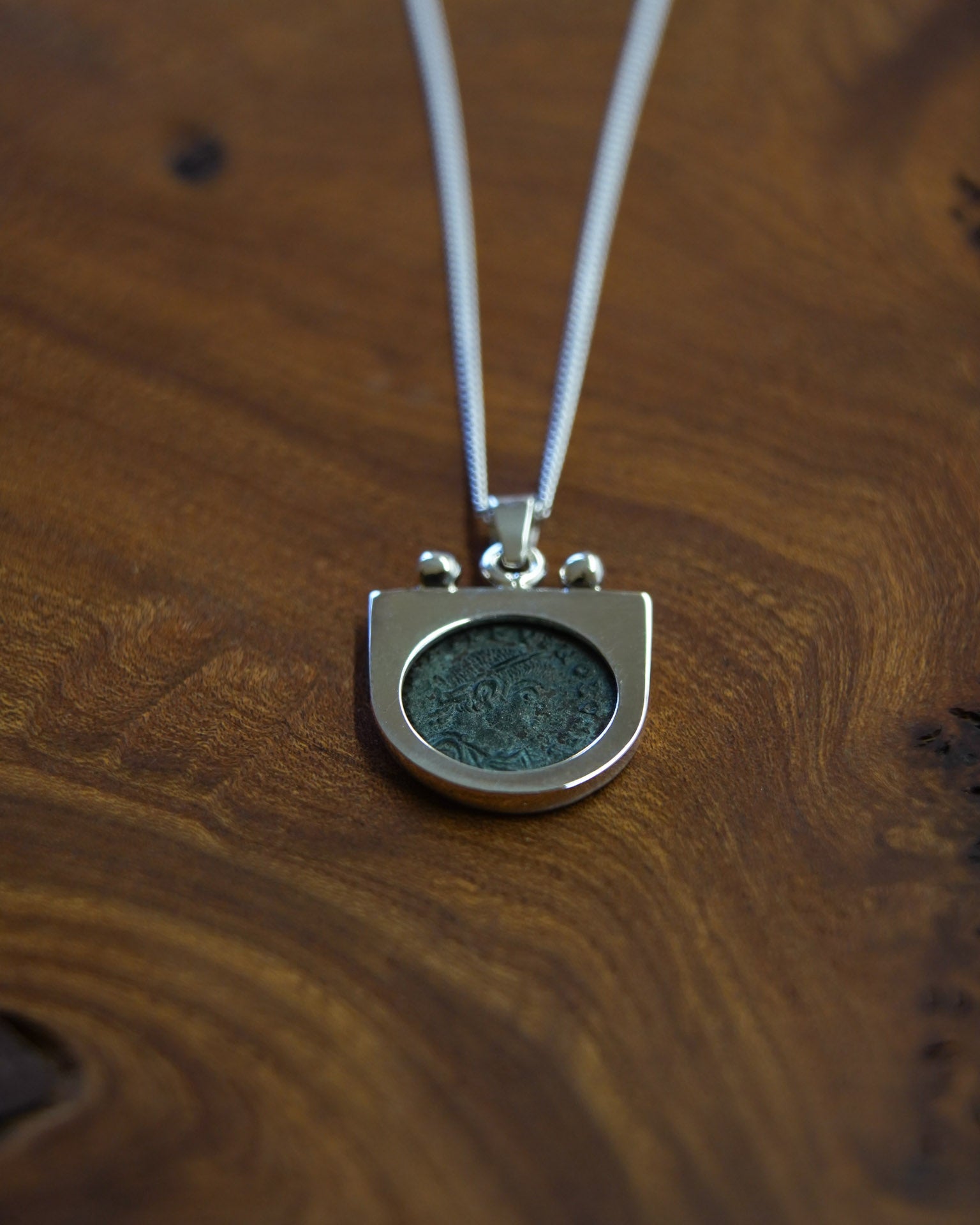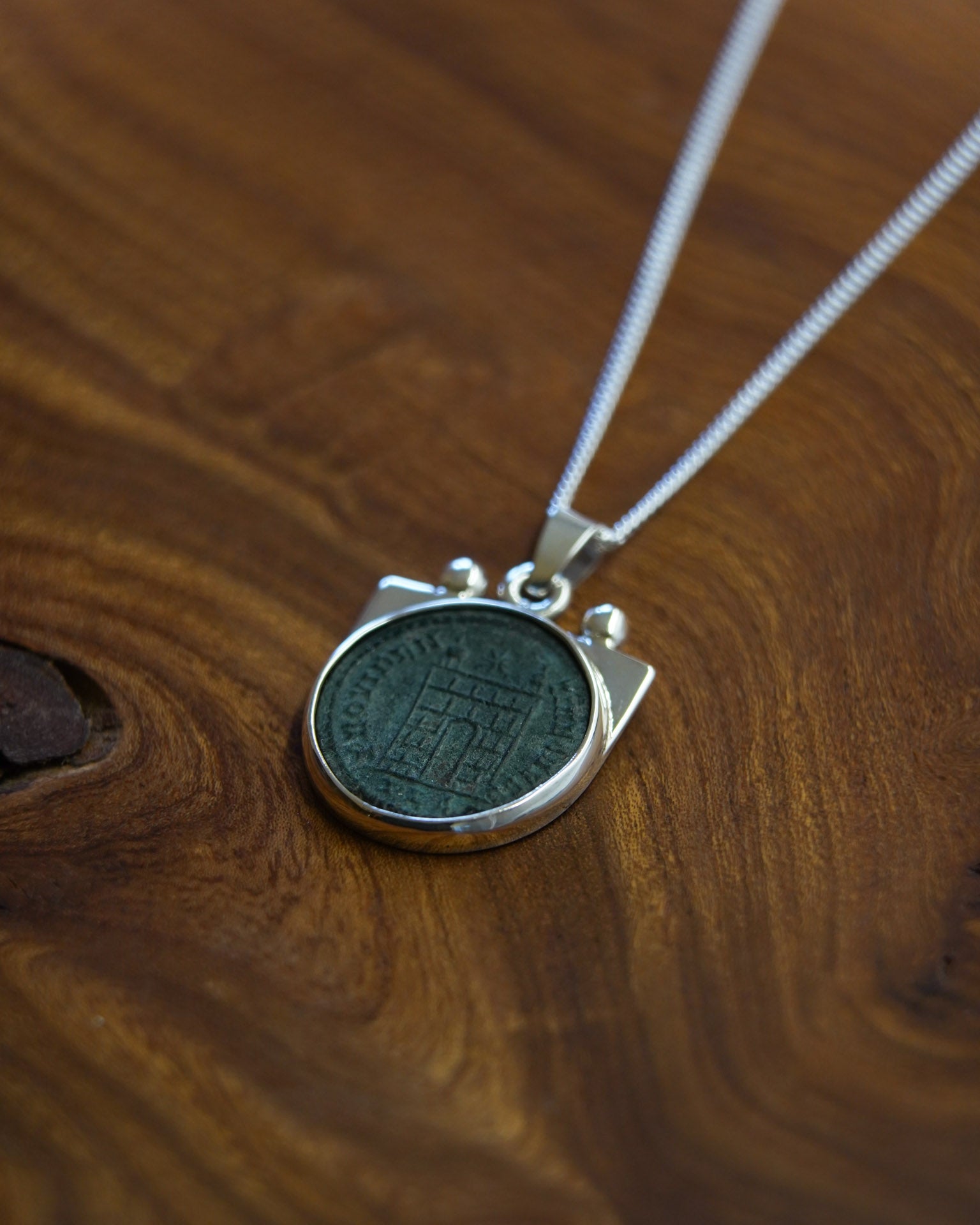 Ce pendentif unique en argent 925 met en valeur une authentique pièce romaine frappée entre 324 et 325 après J.-C., sous le règne de Crispus, fils de Constantin le Grand.