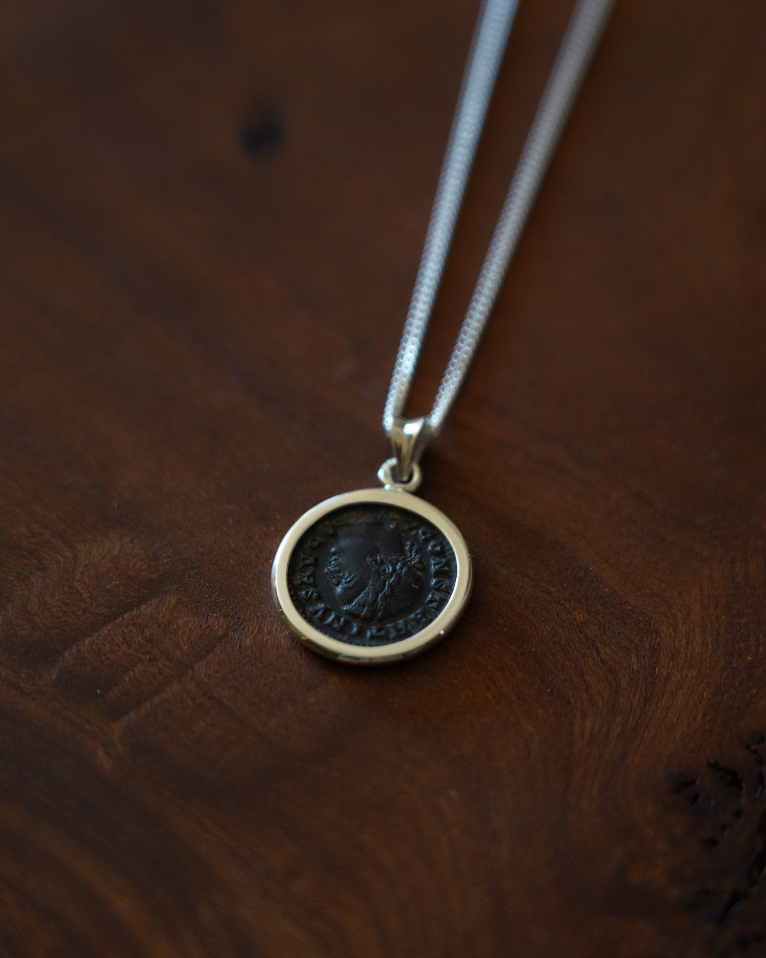 Ce pendentif a été façonné autour d’une véritable monnaie romaine antique, frappée sous le règne de Constantin Ier le Grand, entre 310 et 311 après J.C.