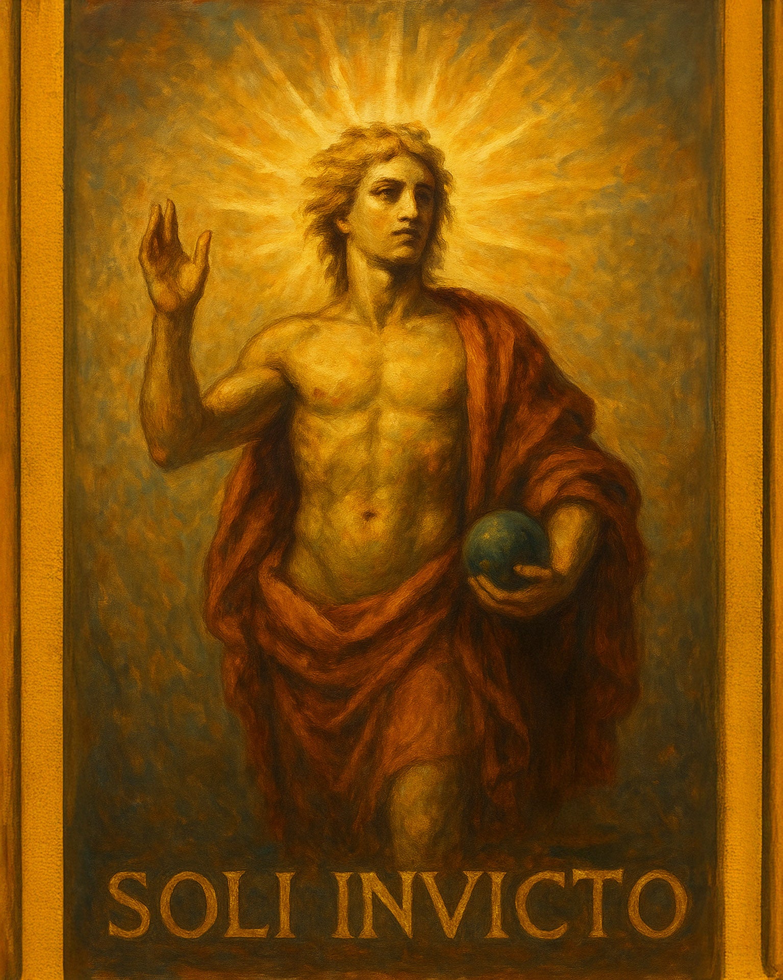 Sol radié, torse nu, debout à gauche, la main droite levée comme pour bénir ou éclairer le monde.